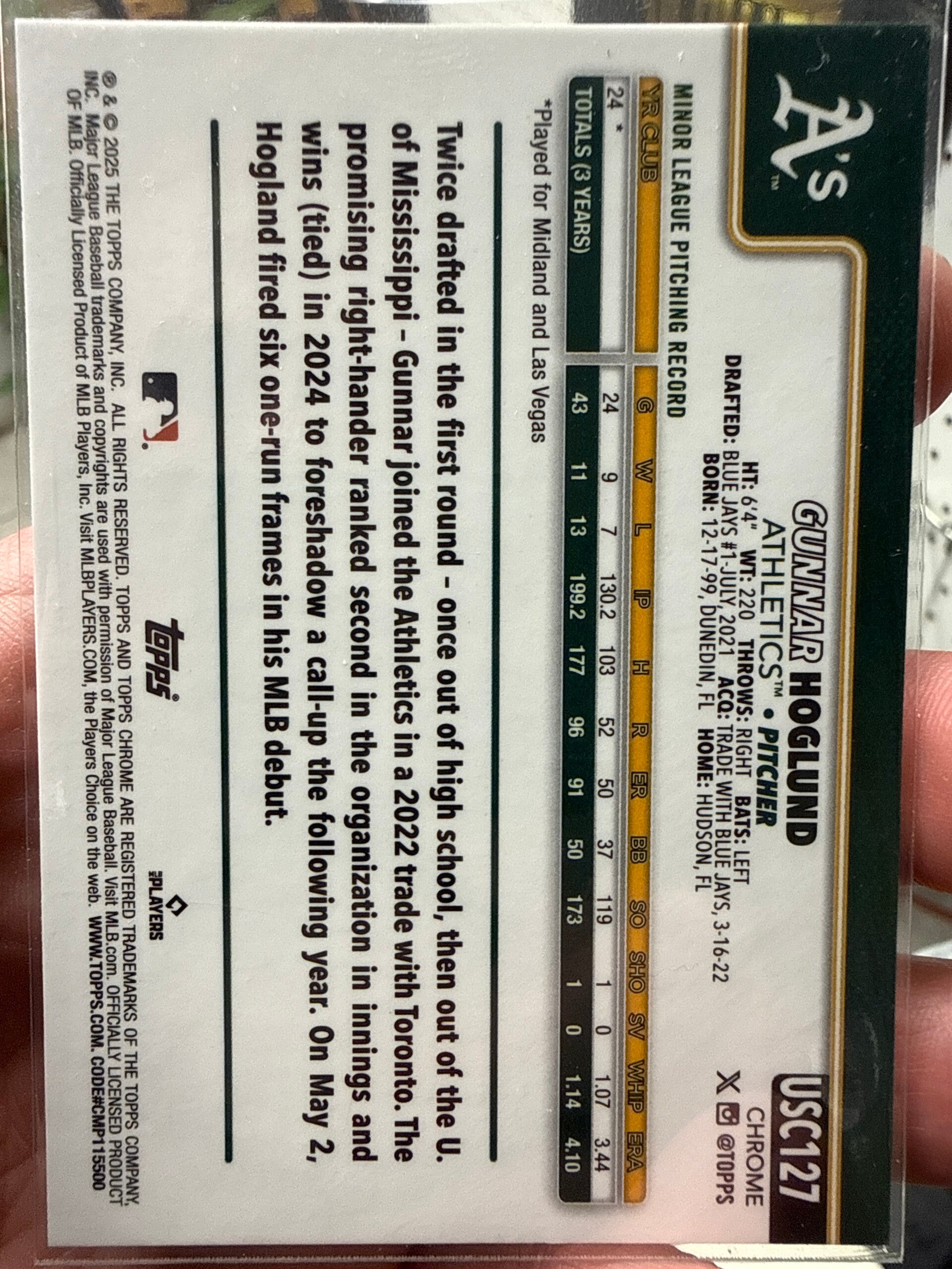 In 2025 Gunnar Hoglund #USC127 Aqua weave numbered /299 Parallel Oakland athletics, rookie card Nm-Mt condition